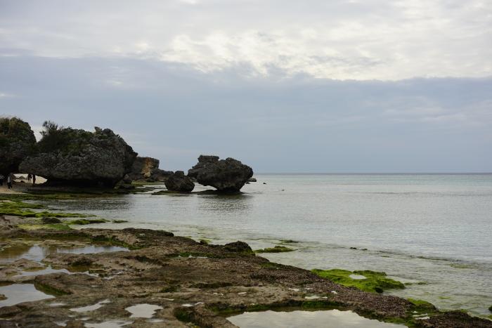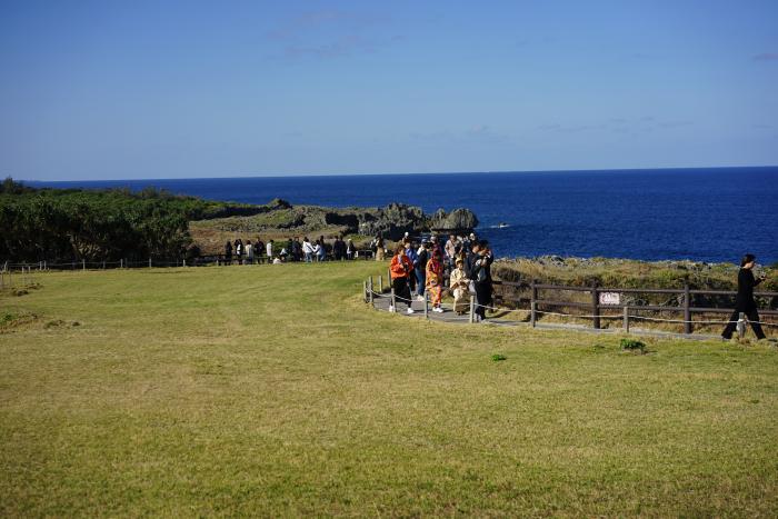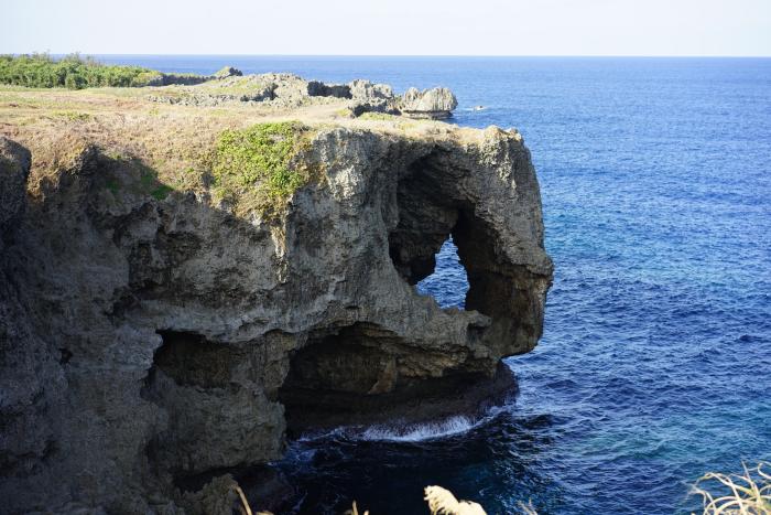 來沖繩旅遊躲不開萬座毛這個景點。萬座毛(Manzamou)在類似沖繩中部國頭郡恩納村的一個海邊景點,這裡的海岸線和自然風光還是很漂亮的。萬座毛的名字來源於當地語言,其中“萬”意味著“萬個”,“座”意味著“座位”,“毛”是沖繩方言中“草原”或“開放空間”的意思,這裡指的是在高約20米的斷崖上有一片寬闊的草地。萬座毛的斷崖形狀也很獨特,經過自然長期的風化和海浪侵蝕,形成了一個像大象鼻子一樣的自然景觀。萬座毛這地方相當於沖繩的一個腰部, 東西陸地很狹窄。