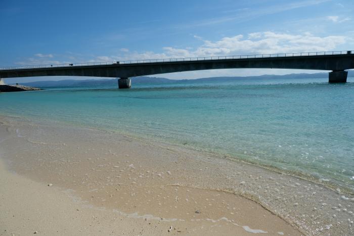 再往北開個幾十分鐘的車程,也是一個遊客必到的景點,叫做谷宇利島海灘。這個景點兒初看感覺一般,但拍出的照片兒還是很漂亮的。在海灘邊有連線沖繩本島的一座大橋。來這裡最好避開中午的時間,陽光逆光一般拍不出好的照片。而且來這裡遊客通常也就是十幾分鍾到半個小時的時間駐留。