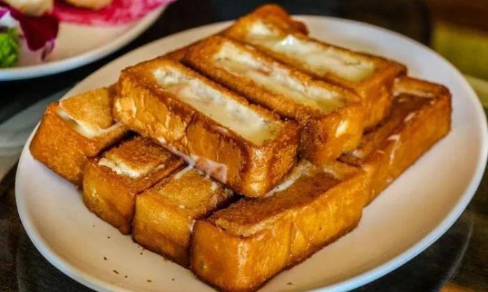 特色:將厚片吐司中間挖空,放入牛奶麵糊、蝦仁、牛肉等食材,再用麵糊封邊後放入油鍋中炸至金黃。因其形狀酷似石板棺而得名,口感酥脆,內餡豐富。
